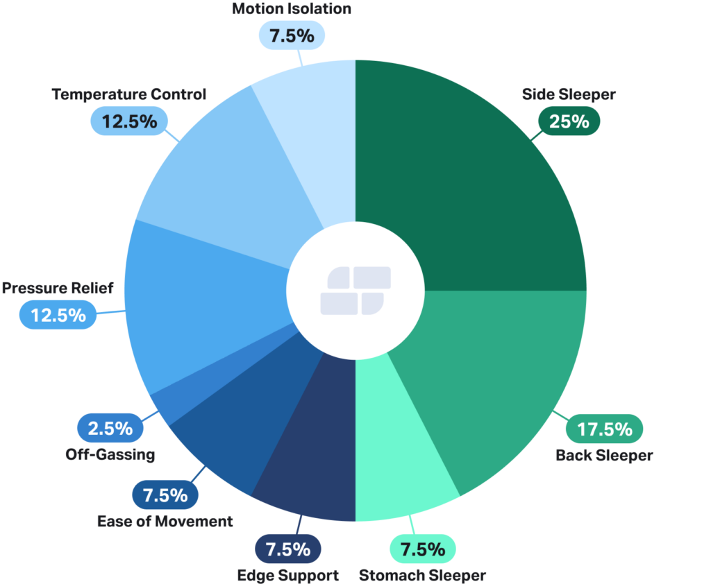 To determine a mattress’s overall score, we assign weighted percentages to performance categories based on how important they are to the individual sleep experience. For instance, areas like pressure relief and temperature control tend to matter more to people than something like off-gassing, and because more people sleep on their side and back than on their stomach, we weigh those positions more heavily