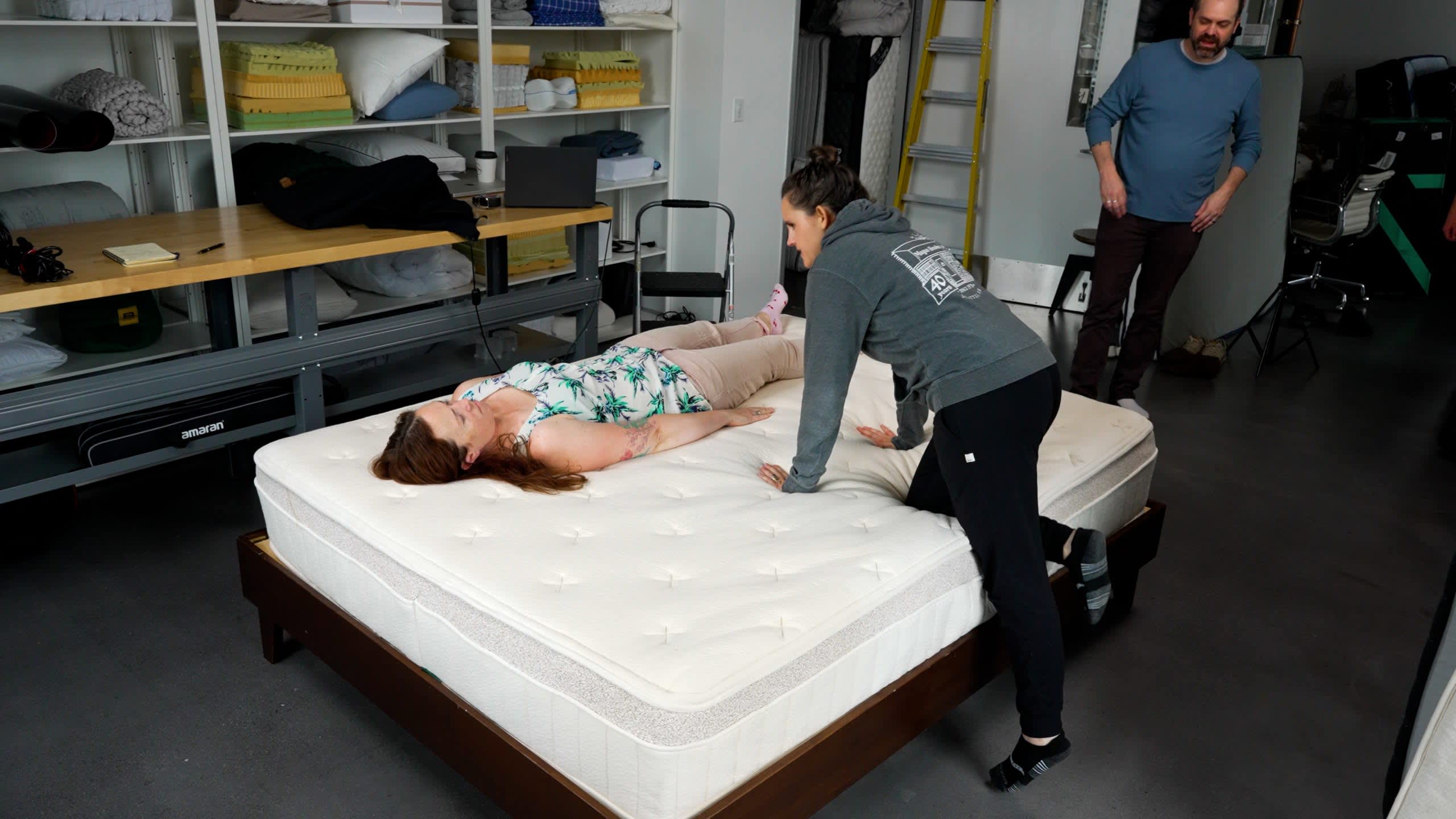 Our testers lie on the surface of each mattress to evaluate factors such as contouring and support. We also use specialized tools to measure performance criteria like pressure relief, heat retention, and motion isolation.