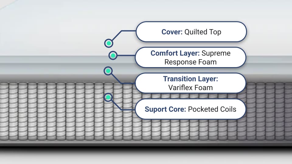 The Signature is constructed with a quilted cover and a comfort layer of gel-infused TitanFlex polyfoam, which has a latex-like responsiveness. This is followed by a layer of firmer VariFlex polyfoam. The support core consists of 8-inch pocketed coils reinforced with a layer of base polyfoam. Altogether, this mattress measures 11.75 inches thick.