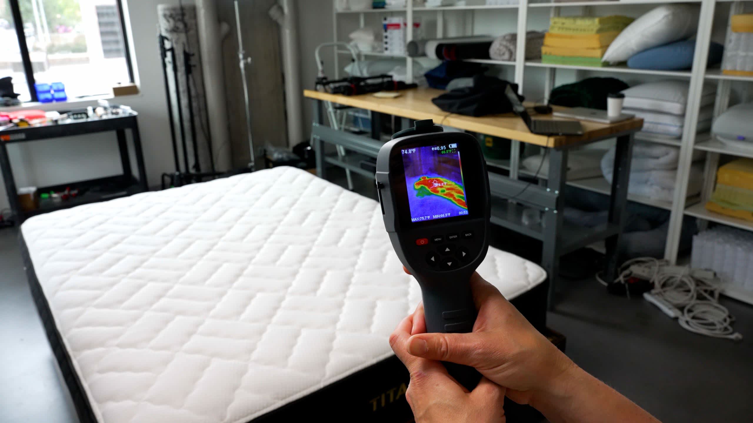 Our testers lie on the surface of each mattress to evaluate factors such as contouring and support. We also use specialized tools to measure performance criteria like pressure relief, heat retention, and motion isolation.